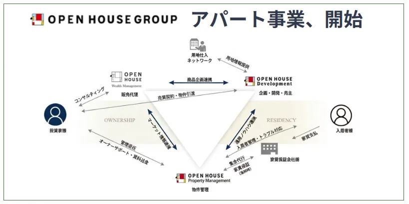 株式会社オープンハウスグループ(以下、「当社」)は、グループ内のビジネススキームを集約し、高付加価値アパートの建築、販売、管理に本格的に取り組むことを発表しました。新しい事業の開始は、都心の土地仕入れの豊富な情報をフル活用し、空間を最大限に活かす設計力、収益性を高める商品企画など、これまでの強みを基盤にしています。