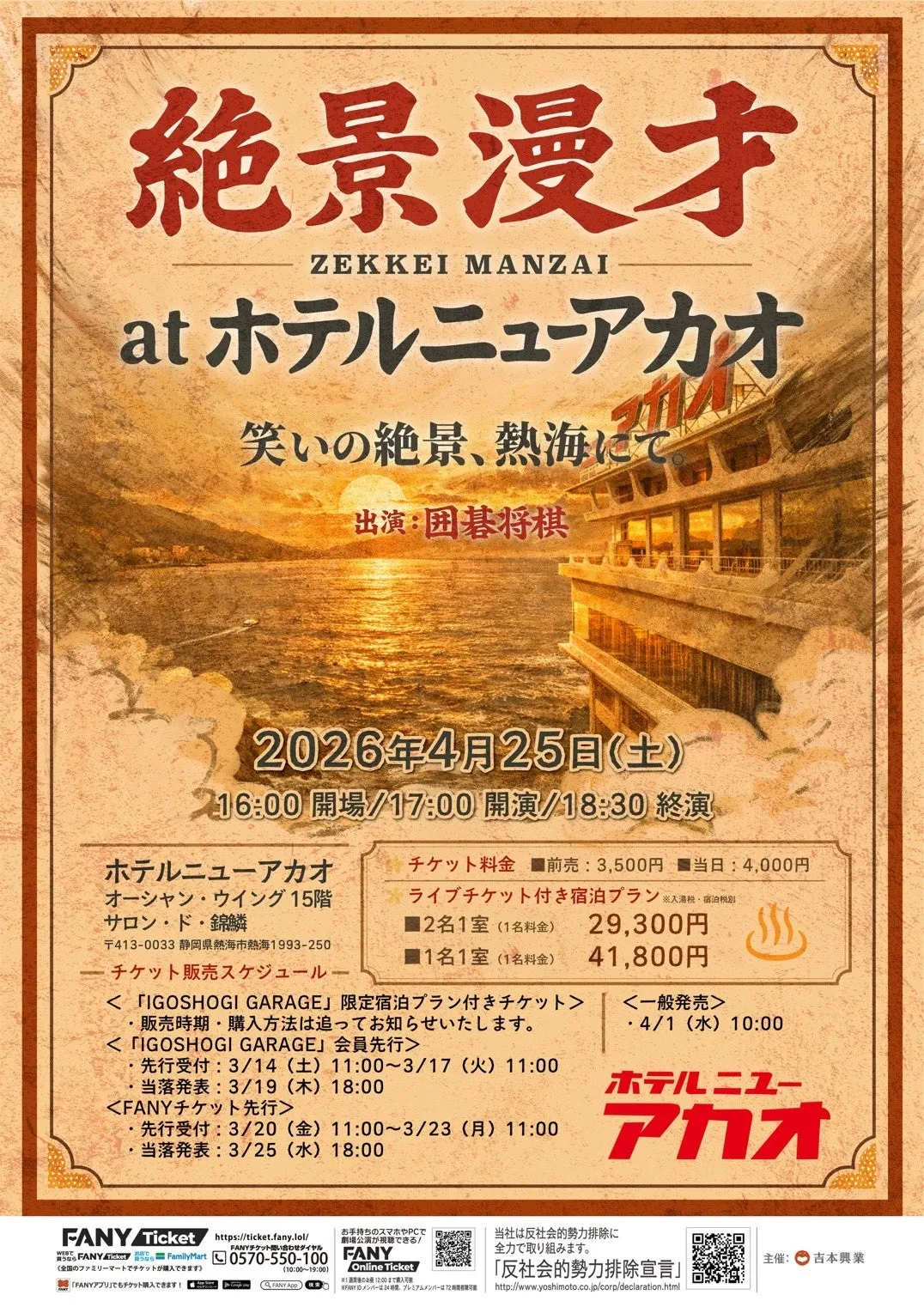 今年4月25日(土)に、囲碁将棋が絶景ホテルで漫才を披露するライブイベント『ZEKKEI MANZAI』が静岡県熱海市の「ホテルニューアカオ」にて行われることが決まりました。このイベントは、全国の美しい風景を舞台に漫才を届けるという新しい試みから生まれたもので、多くのファンに支持されています。