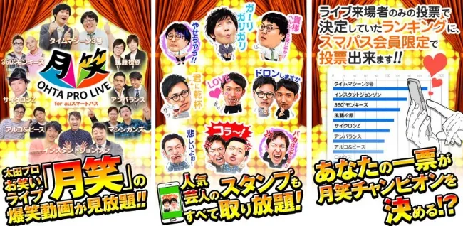 今すぐアプリをダウンロードして、"月笑"をもっと楽しむ方法があります。"太田プロライブ 月笑for auスマートパス"では、今まで以上にアクセスしやすく、過去に披露された爆笑ネタがすべて見放題となります。これにより、タイムマシーン3号や360°モンキーズ、アルコ&ピースなど、名だたる芸人たちのショーを好きなだけ視聴できます。