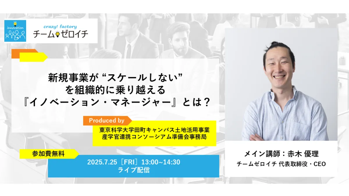 このセミナーでは、大企業における新規事業がなぜスケールしないのか、具体的なボトルネックや過去の実例を基にした課題解決策を探ります。セミナーは二部構成で行われ、第一部では「チーム・ゼロイチ」の代表である赤木優理氏が登壇し、大企業が直面する新規事業創出の課題とその解決策について分析します。赤木氏は、未熟な社員であっても機能する「イノベーション・マネージャー」の役割についての提案を行い、実際の事例と共に具体的な方法をご紹介します。
