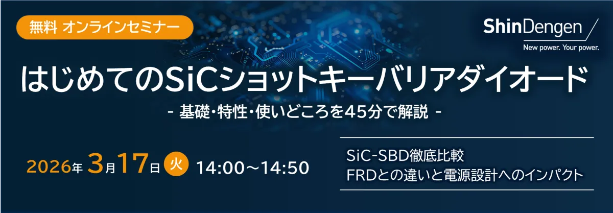 新電元工業は、2026年3月17日火曜日の14時から15時までの50分間、SiCショットキーバリアダイオード(SiC-SBD)に焦点を当てた無料のオンラインセミナーを実施します。このセミナーは、主に回路設計エンジニアを対象にしています。参加には事前登録が必要で、URLは申込者にご連絡します。