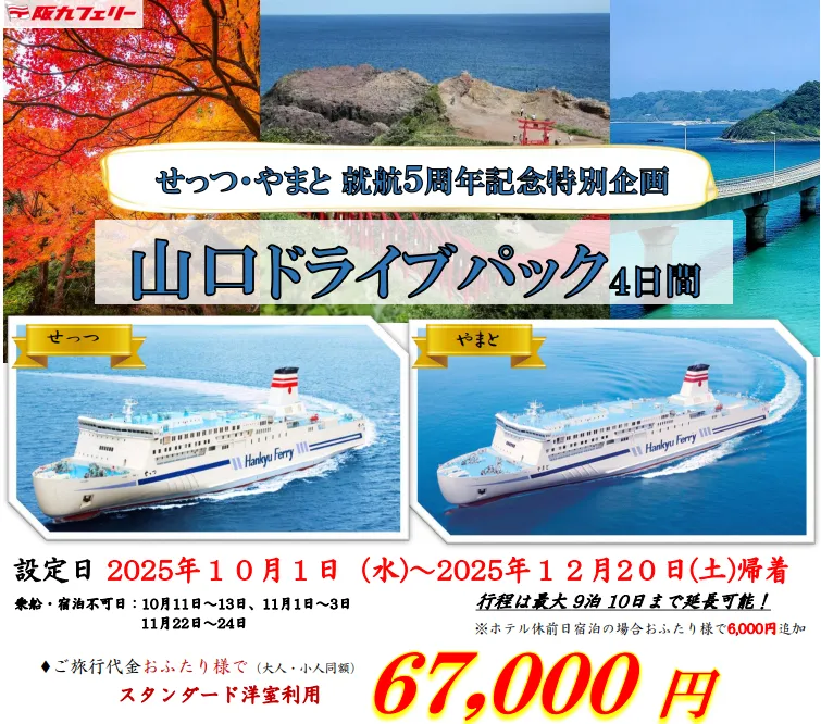 2025年の秋、阪九フェリーが提供する「山口ドライブパック」が、せっつ・やまと就航5周年を記念して登場します。このパックでは、旅行者に特別なお得感を提供し、多くの観光名所を巡る機会を与えます。