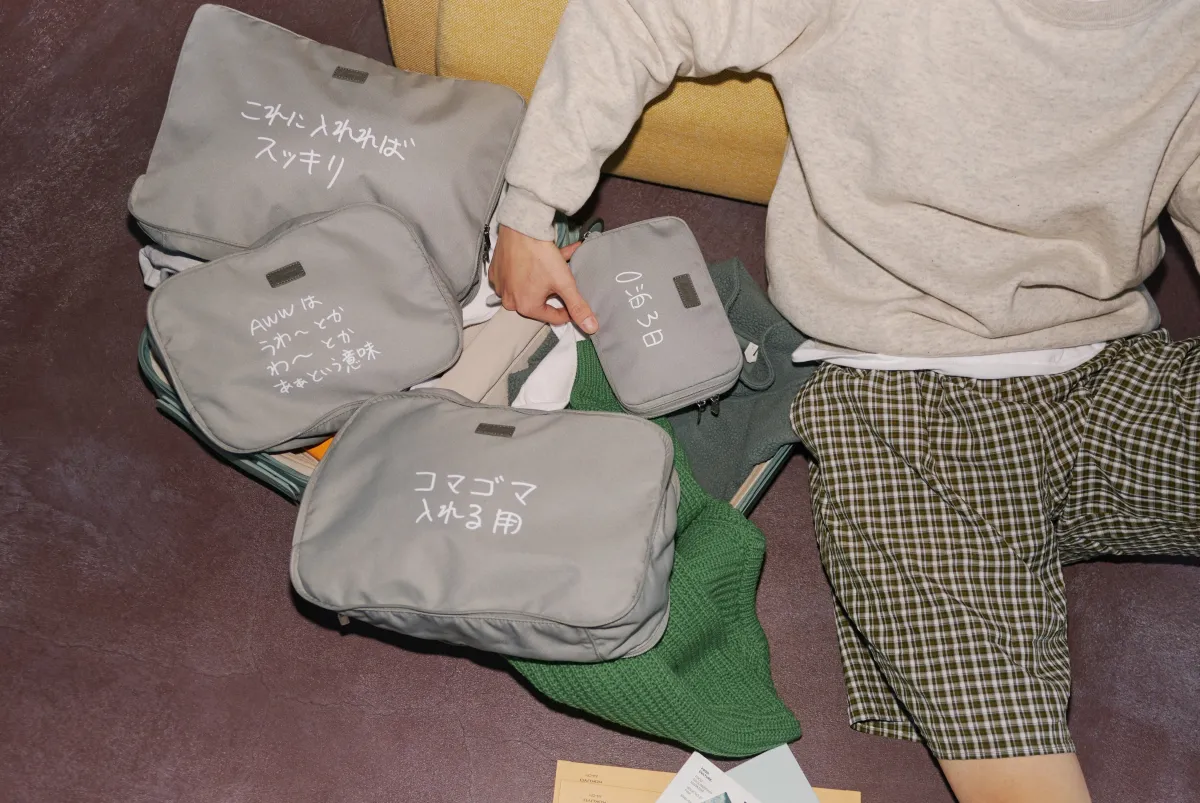 この限定コレクションでは、Awwの人気商品であるパッキングキューブやトラベルポーチなど、4つのアイテムが登場。加賀美氏は、各アイテムに手書きの言葉を大胆にプリントし、旅先での思いを一瞬で思い出させる遊び心を持った仕上がりになっています。「これに入れればスッキリ」や「どこに何をしまったかわからなくなった」といった言葉が、日常の旅の中で感じる思いを代弁してくれます。