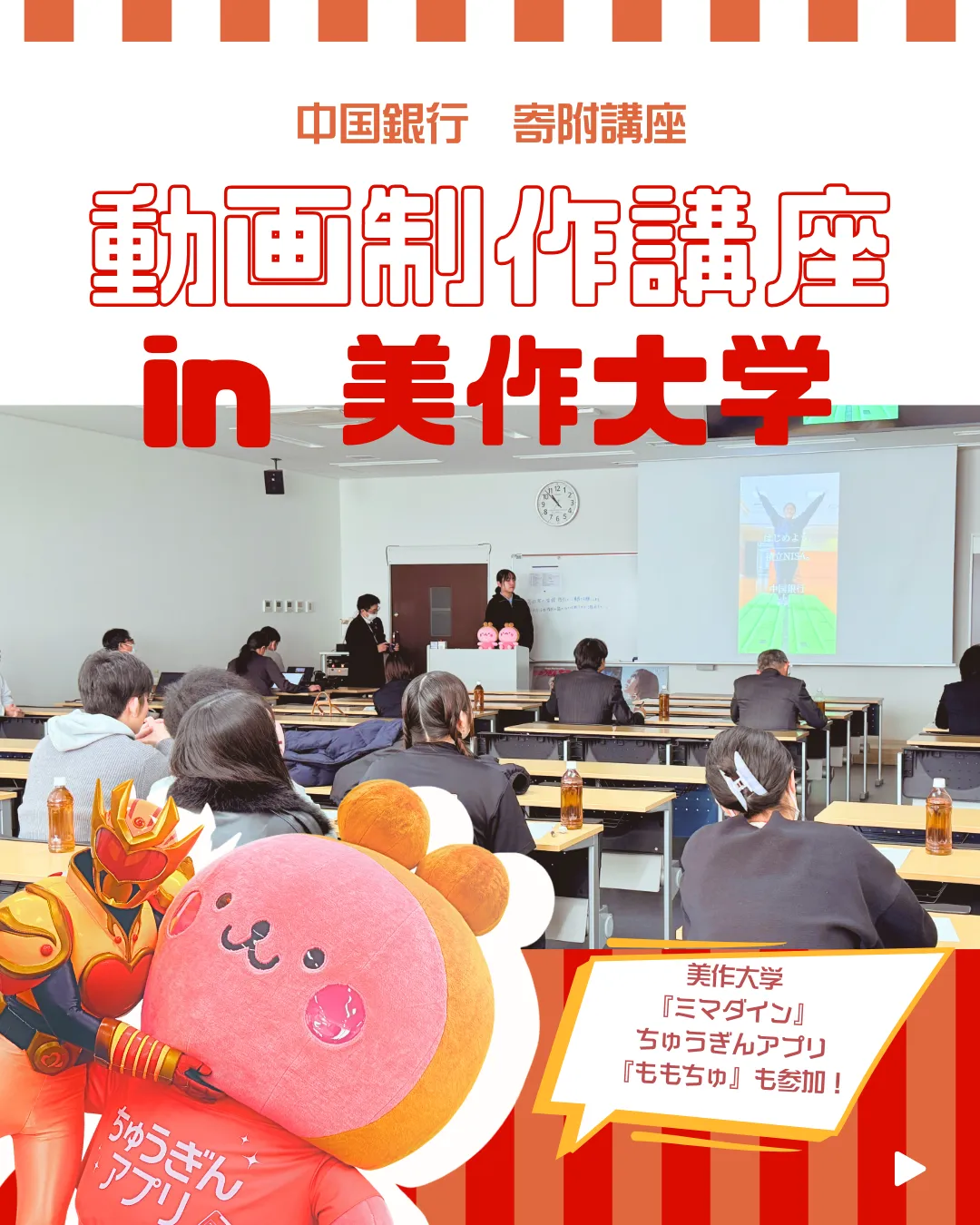 2026年2月、中国銀行と美作大学が協力して「動画制作講座&コンテスト」を開催しました。この取り組みは、学生たちが創造力を発揮しつつ、実際の動画制作を通じて学ぶ貴重な機会となりました。