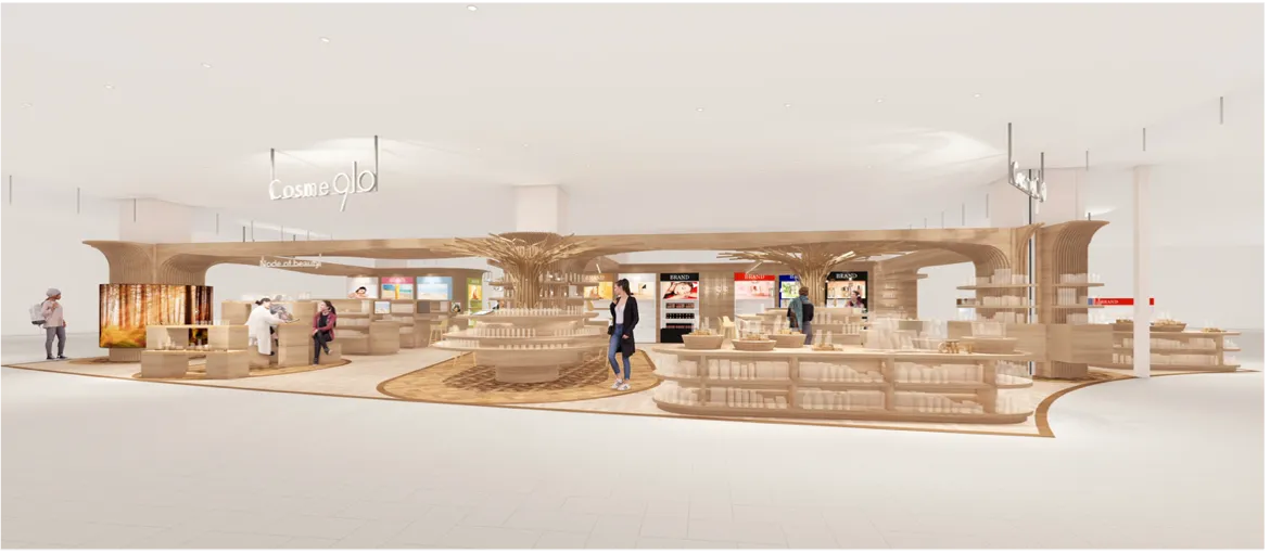 空間デザインのコンセプトは「Node of beauty」です。旭川の豊かな自然との調和を考え、“都市の中の森”をイメージして設計されています。木の温もりを利用した什器や、中心に設置されたツリー型ディスプレイは、人々をつなぎ、美を生み出す結節点を象徴しています。開放感あるレイアウトにより、セルフセレクトとカウンセリングが共存可能な空間を実現し、世代を問わず「キレイ」を楽しむ新しい場所としての取り組みがされています。