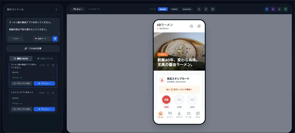 利用者は作成したいアプリの特徴やイメージを自然な言葉で入力するだけで、デバイスに応じたモックアップを3分で生成できます。このため、プログラミングやデザインの専門知識がなくても直感的に利用できます。