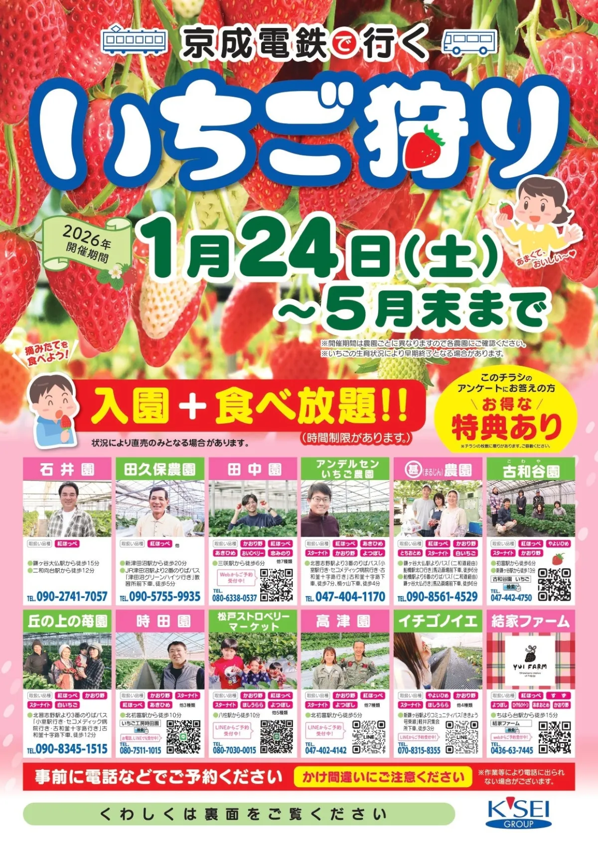 本企画では、各駅に設置されているチラシのアンケートに記入して入園時に持参することで、通常料金から100円の割引が受けられます。また、参加農園は様々で、いちご狩りを楽しむことができるという魅力を持っています。