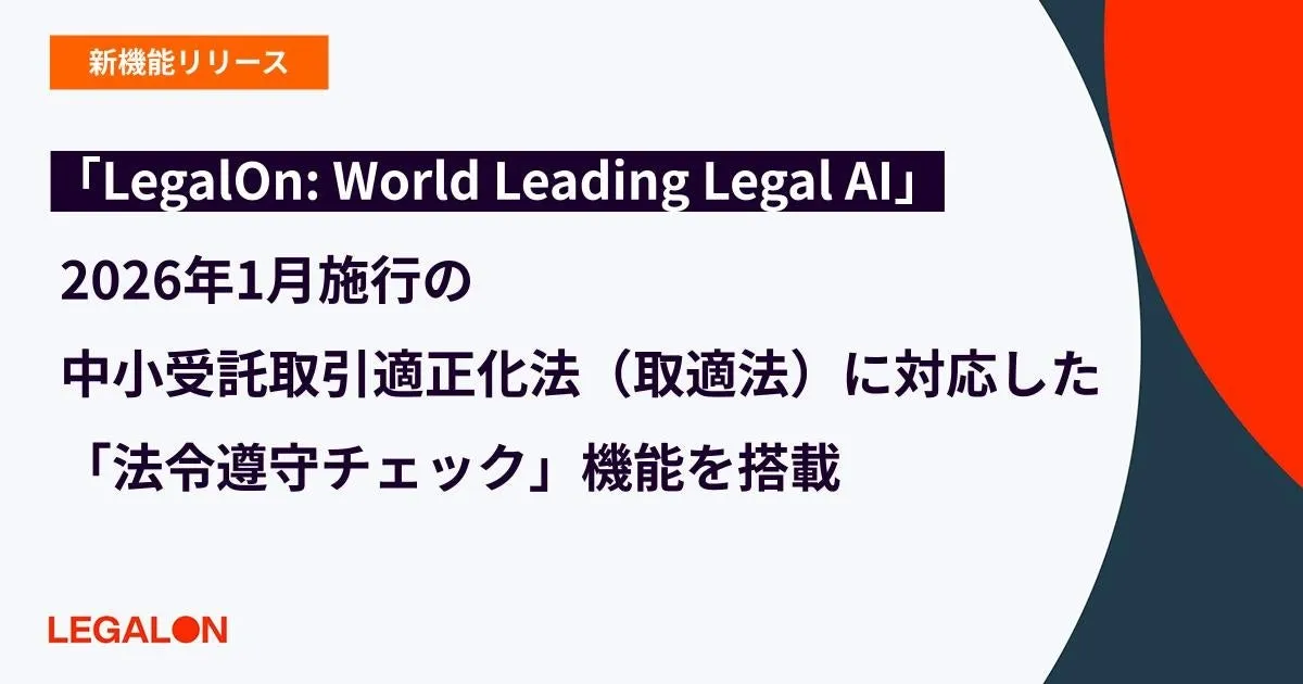 株式会社LegalOn Technologies(以下、LegalOn)が提供する「LegalOn: World Leading Legal AI」が、2026年1月1日から施行される「中小受託取引適正化法」に対応した新機能を発表しました。この新機能は、契約書をレビューする際に法律に則っているかを自動でチェックする「法令遵守チェック」です。