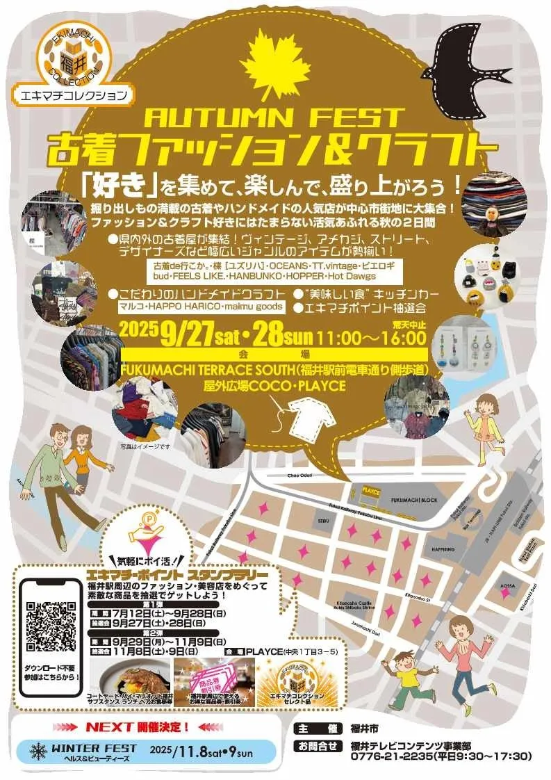 2025年9月27日(土)と28日(日)、福井市の中心市街地が活気にあふれます。「エキマチコレクション オータムフェス 古着ファッション&クラフト」が、駅前のFUKUMACHI TERRACE SOUTHや屋外広場COCO、PLAYCEといった場所で開催され、幅広いジャンルの古着やハンドメイドクラフトのお店が集結します。