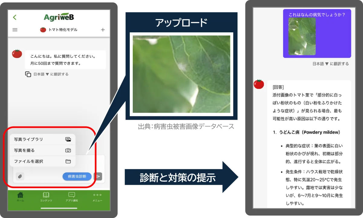 新たに追加された病害虫画像診断機能では、ユーザーが病変部分の画像をアップロードするだけで、AIが病害虫を瞬時に判別し、関連する最適な対策を提案します。これにより、営農指導員や農業者は、迅速な対応が求められる状況でも、専門家のサポートを受けられるようになります。