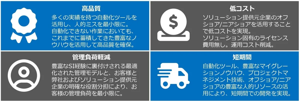 高品質な移行を実現するための自動化技術を活用し、プログラム資産、文字コード変換、データ移行の作業を効率よく行います。このプロセスでは人的ミスを最小限に抑え、低コストかつ均質な移行を実現します。