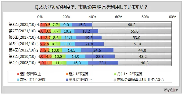 調査によると、胃腸薬を利用する人の中で、月に一度以上頼っているという割合は、4割弱にとどまっています。特に男性の10代から30代でこの比率は高く、なんと6割弱に達しています。これは若年層において胃腸が不調を訴える人が多いことを示唆しています。