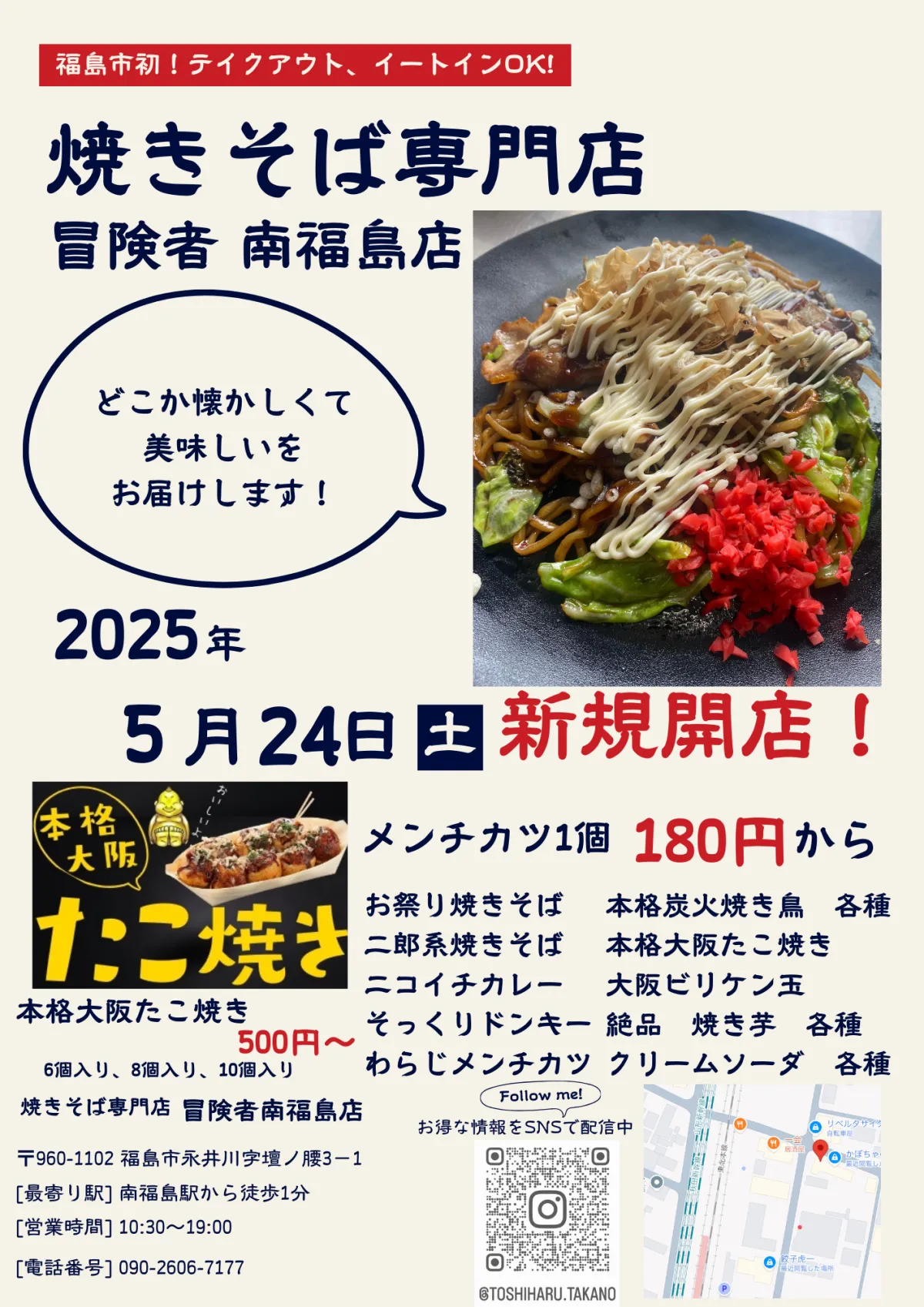 2023年5月24日、福島市の南福島駅近くに焼きそば専門店『冒険者南福島店』がオープンしました。店電話番号は090-2606-7177で、特にテイクアウトに力を入れています。