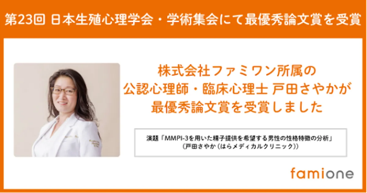 2023年、ファミワンの公認心理師であり臨床心理士である戸田さやかは、東京で開催された第23回日本生殖心理学会・学術集会において最優秀論文賞を受賞しました。この受賞は、彼女の研究が生殖医療における心理的ケアの重要性を認識されるきっかけとなり、今後の医療界における心理的サポートの発展に寄与することが期待されます。