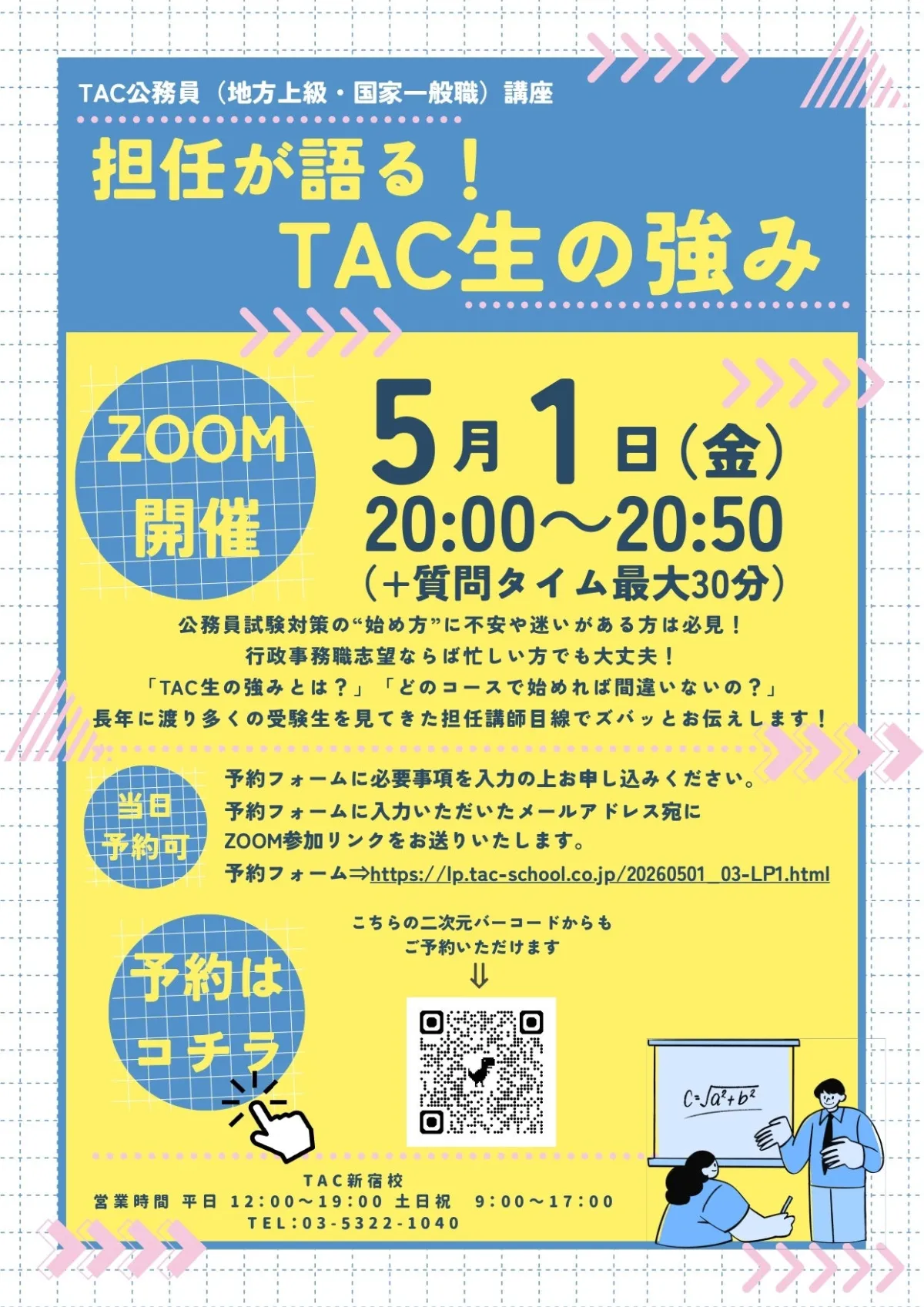 資格取得を支援するTAC株式会社が、2026年5月1日(金)にオンラインで「担任が語る!TAC生の強み」と題したセミナーを開催します。このイベントは、公務員試験を考えている方を対象としており、オンラインの特性を活かして全国から参加可能です。