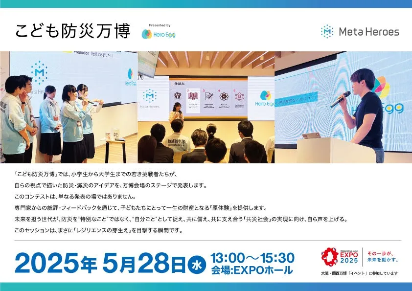 2025年5月28日(火)、大阪では新しい形の防災イベント、「こども防災万博」が初めて開催されます。このイベントは、株式会社Meta Heroesが主催し、次世代の防災リーダーである子どもたちが自らのアイデアを発表する特別なプログラムです。特に、小学生から大学生までの若者たちが、自分たちの視点で未来の防災や地域社会の在り方について考え、その想いを社会課題解決につなげることを目的としています。