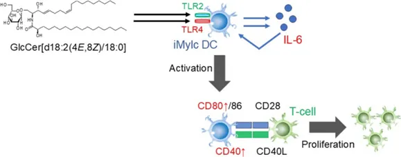 - - このグルコシルセラミドは、樹状細胞上のトール様受容体(TLR)2および4に結合し、IL-6を放出します。