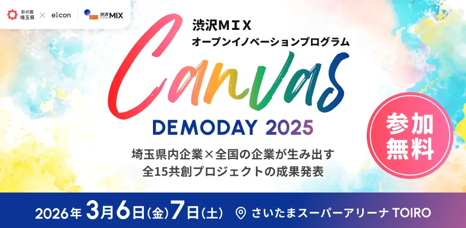 埼玉県と株式会社eiiconが共催する『Canvas DEMODAY 2025』が、2026年3月6日(金)と7日(土)の2日間、さいたまスーパーアリーナのTOIROで行われることが発表されました。このイベントは、オープンイノベーションプログラム「Canvas」の成果を発表する場として、多くの企業の参加が期待されています。