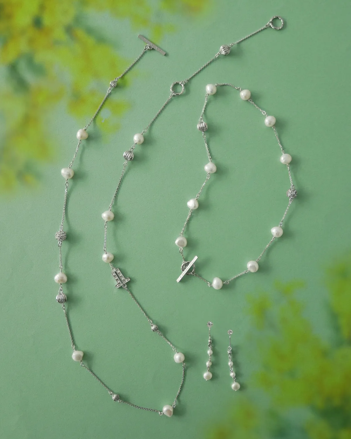 新作のアクセサリー群は、特に淡水パールの持つ独特の輝きが魅力。ネックレスやブレスレット、ピアス、イヤリングなどがラインナップされ、どれもがシンプルながらも一際目を引く存在感を持っています。例えば、マーガレットのつぼみをイメージしたメタルボールやパヴェボールをあしらったデザインは、リズミカルでありながらも上品さを失わず、洗練された印象を与えています。