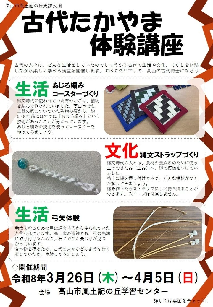 春休みにピッタリの体験講座が高山市風土記の丘史跡公園で開催されます。この講座では、古代の人々の暮らしや文化を実際に体験しながら楽しく学ぶことができます。様々なアクティビティを通じて、参加者は古代の知識を深め、「たかやまの古代博士」を目指すことができます。