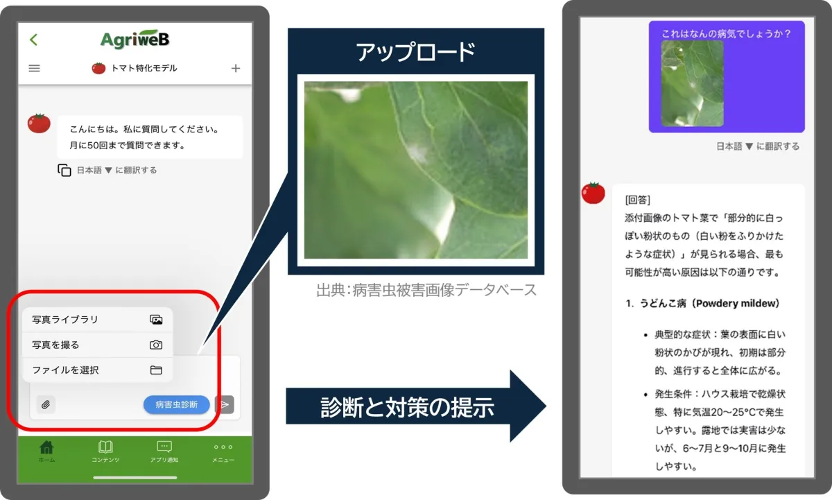 営農指導員は、気象情報をもとに作物の育成状況を判断し、必要な栽培技術を提供する役割を担当しています。しかし、経験だけでは情報を網羅することが難しくなっている現状があるため、AIが提供する正確なデータとアドバイスが求められています。栽培アシストAIは、学術論文や防除データを解析し、植物の健康状態や病害虫の発生をリアルタイムで判断します。
