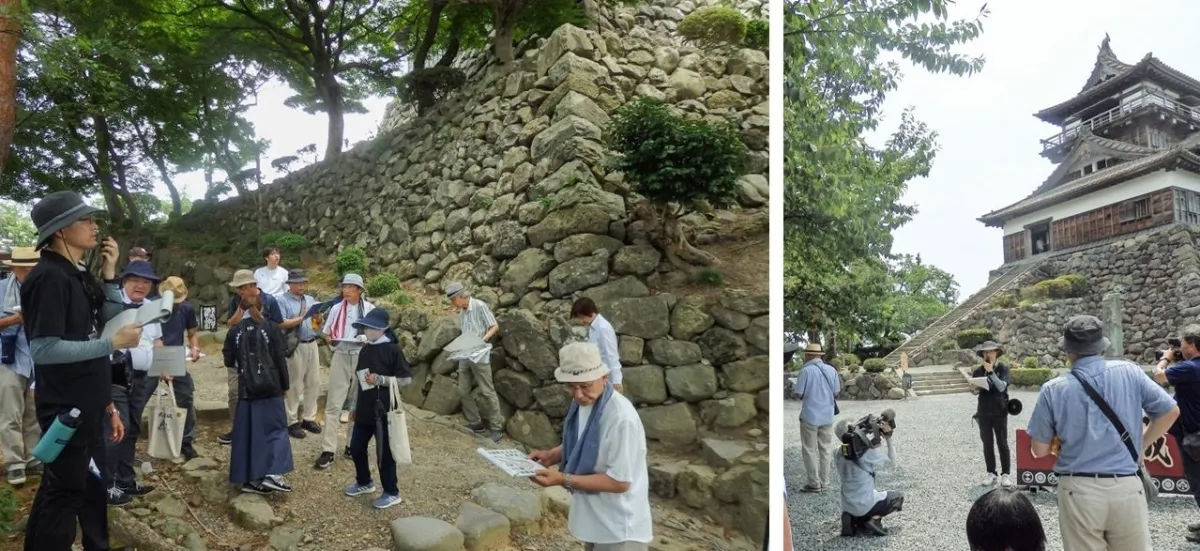 この日のエクスカーションには、坂井市の議員や文化財保護に関わる学識者も参加。市教委の学芸員に案内されながら、天守との距離を縮め、石垣の現状や植栽の成長を観察しました。「天守の屋根瓦が美しく見えるように高い木々を除去するべき」との意見もあり、美しさと保全のバランスが求められています。また、丸岡城は現存する十二天守の中で、城やその周辺が国の史跡として指定されていない唯一の城であるため、文化的価値の再確認も重要な課題です。