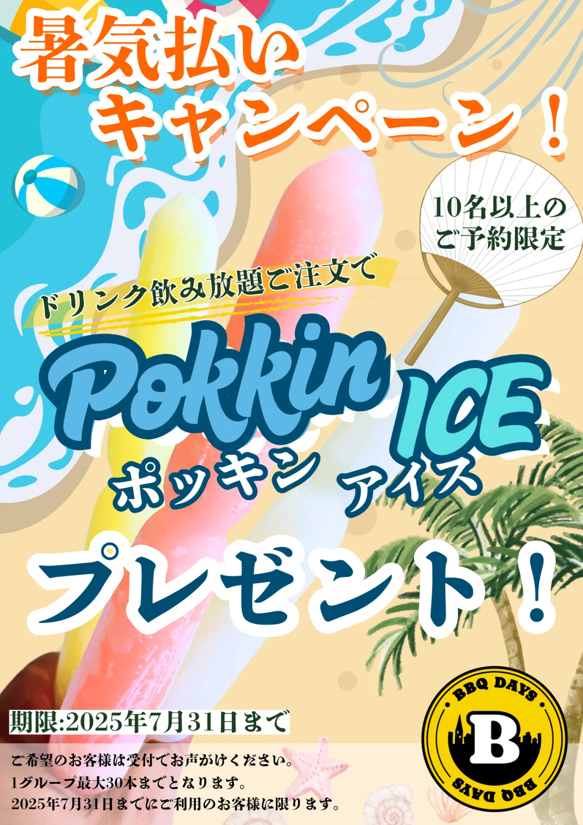 このキャンペーンは、10名以上のグループが対象です。期間中、飲み放題プランをオーダーしたグループには、特製の“ポッキンアイス”を人数分プレゼント!懐かしの冷たいスイーツが、BBQをより一層楽しいものにしてくれます。夏の暑さが厳しい今、火照った体をひんやりと癒してくれる存在です。