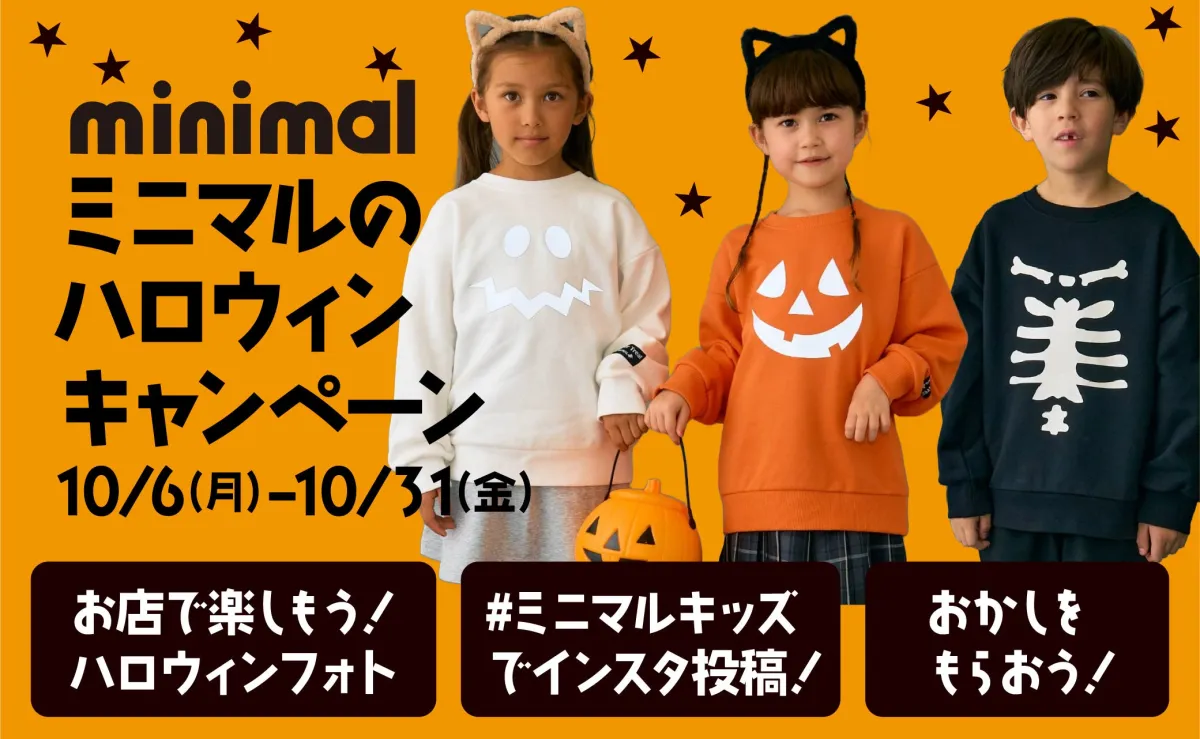 仮装をしての来店も大歓迎なので、ぜひこの機会にお子様と一緒に楽しいひとときを過ごしてください。ミニマルは、子供たちの個性を大切にするブランドとして、そんな親子の新たな思い出作りを全力でサポートします。