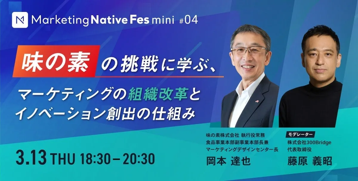 第4回目となる「Marketing Native Fes mini」では、味の素の岡本達也さんが登壇します。彼は食品事業本部副事業本部長として、組織改革を進める中での経験や成功事例を共有。さらに、ヒット商品を生み出すために必要な組織の条件や、改革時に直面する課題の解決法についても深く掘り下げた話を聞くことができます。