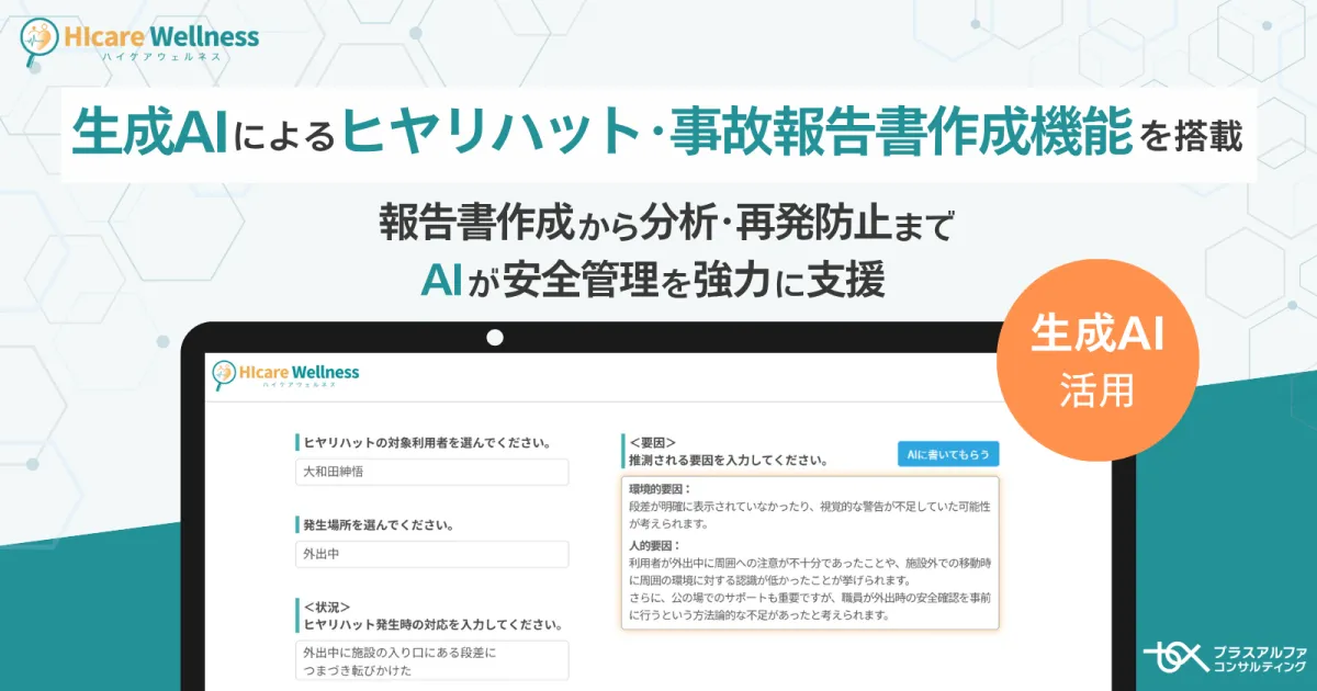 株式会社プラスアルファ・コンサルティングが提供する統合型ケアマネジメントシステム「ハイケアウェルネス」が、医療・介護現場でのヒヤリハットや事故に関する報告書作成において、生成AI機能を新たに追加しました。この機能により、報告書を迅速かつ効率的に作成し、職員の業務負担を軽減することを目指しています。