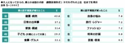 条件の異なる親子の会話で、特に「健康・病気」に関する話題が増えていることがうかがえます。大人になってから親と話す内容の頻度が増えたことに関して最も多かったのは「健康・病気」で、次いで「日常の出来事」や「家族・親戚」、そして「食事・グルメ」が続きました。この結果は、親の健康状態に対する関心が高まっていることを示しています。