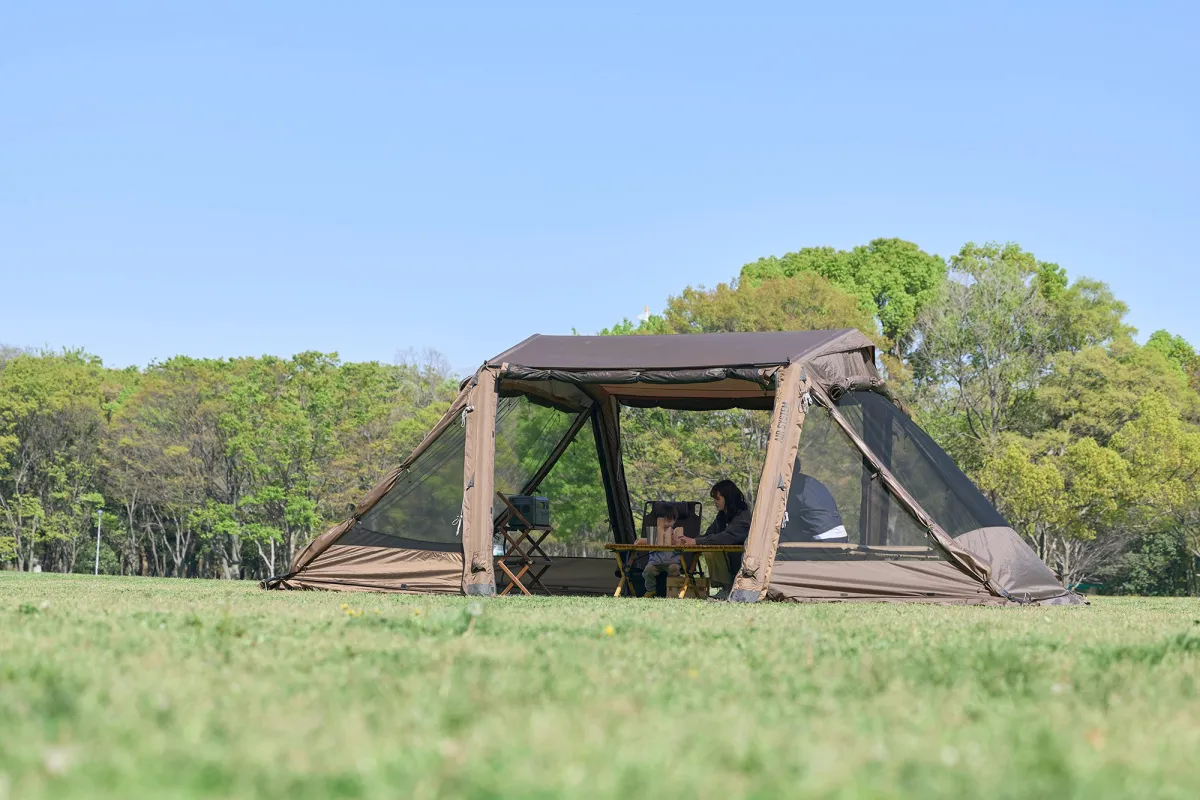 このエアテントは、最大室内高200cmの快適な居住性を実現。前後左右に4方向の出入り口があるため、サイトのレイアウトや風向きに応じた自由な設計が可能です。それに加え、360度フルオープン機能を備えており、天気や景観に合わせて空間をカスタマイズできます。さわやかな風を感じながら、自然の中で過ごす贅沢を体験できるでしょう。