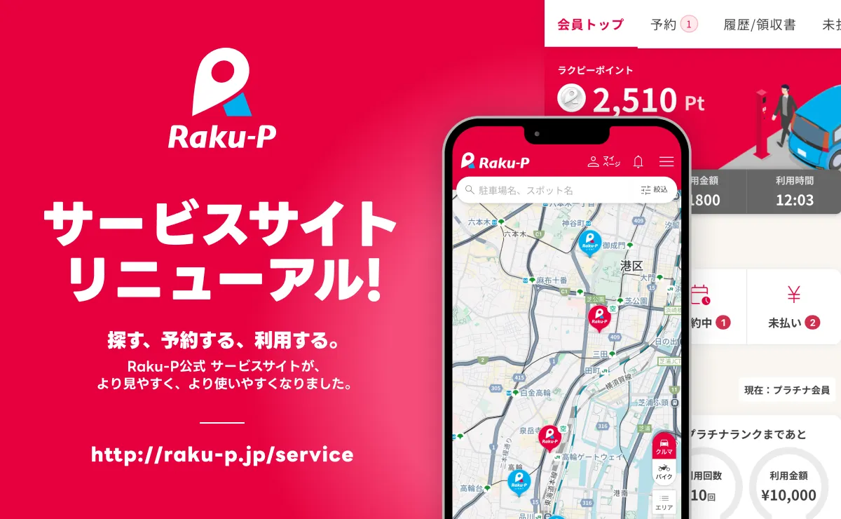 「Raku-P」は、AIを使ったナンバー認証やキャッシュレス精算により、煩わしいロック板が必要なく、スムーズな駐車体験を提供しています。この度のリニューアルは、利用者がより快適にサービスを活用できるよう、デザインを刷新し、情報を探しやすくすることで、操作性も改善されました。