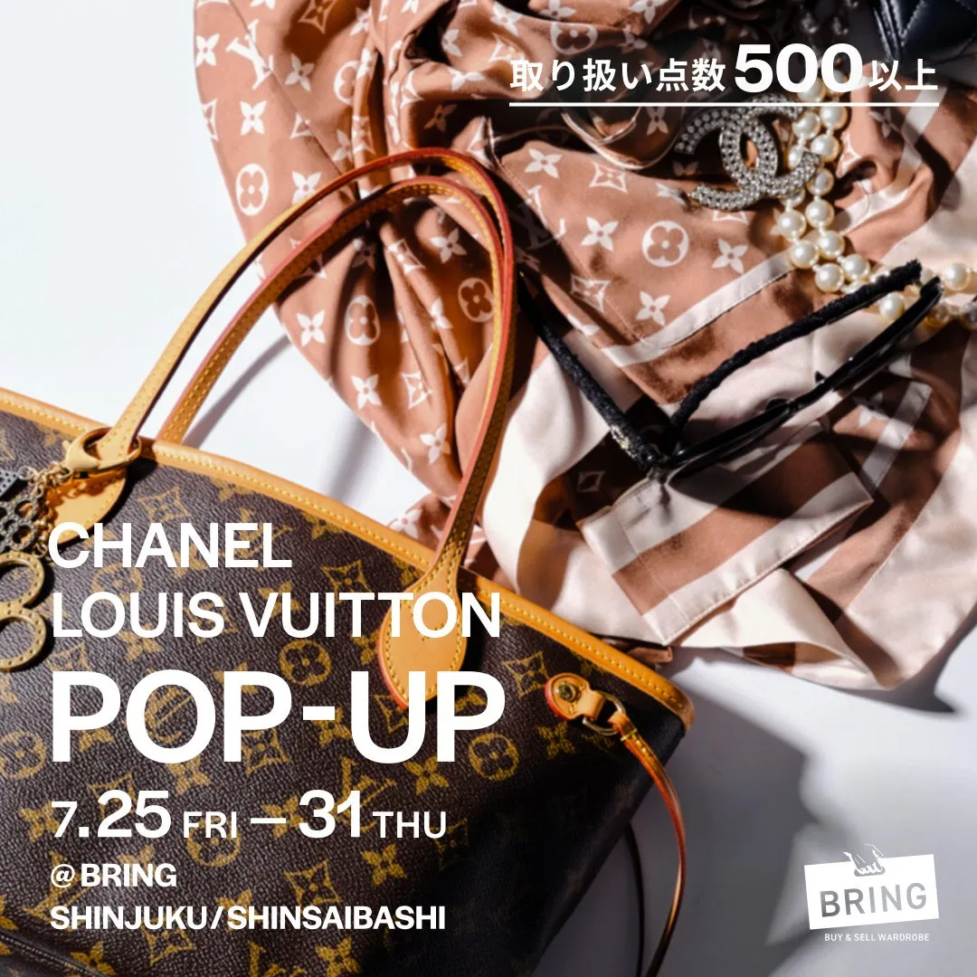 このポップアップイベントの正式名称は「CHANEL・LOUIS VUITTON 期間限定POPUP イベント」です。実施期間は2025年7月25日(金)から7月31日(木)までの7日間で、イベント対象店舗はBRING新宿店とBRING心斎橋店となっています。多くの方々にお越しいただきたいと思い、イベント期間中は店内の商品全てがCHANEL・LOUIS VUITTONのアイテムのみとなります。
