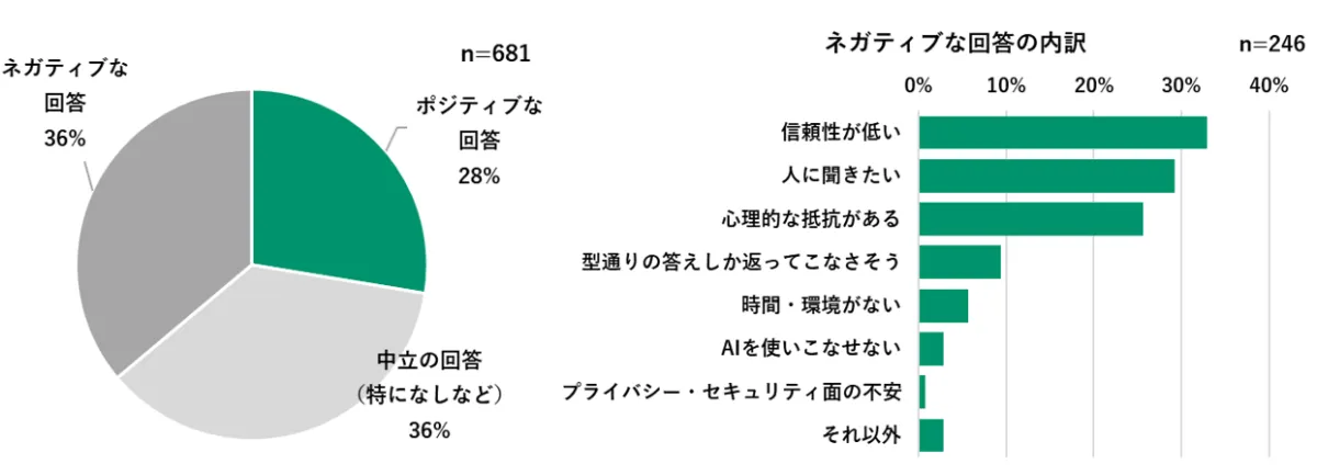 AIを使用することに不安を感じている理由として、「回答の信頼性への不安」「心理的抵抗感」がそれぞれ25%を占めています。実際、デジタルツールを日常的に使用している人はAI活用に積極的である一方、そうでない人は抵抗を感じやすい傾向があります。