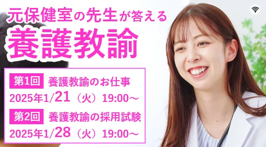 続いて、1月28日(火)19:00 ~ 20:00 には、養護教諭の採用試験に特化したセミナーが行われます。このセミナーでは、受験準備や必要な対策について具体的にアドバイスが提供されます: