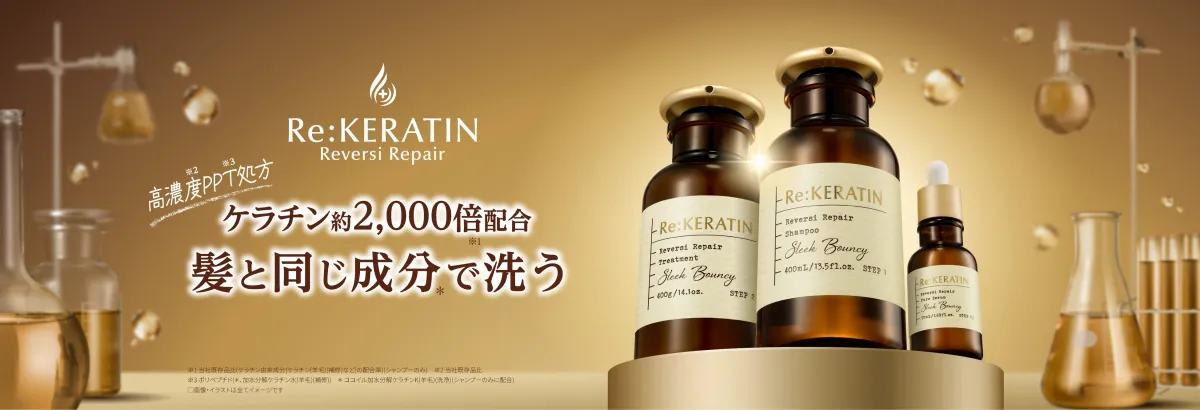 髪の80~90%はタンパク質から成り立っており、その中で特にケラチンが重要な役割を果たしている。しかし、カラーリングや日常の摩擦、乾燥などの影響で、ケラチンは簡単に失われてしまう。「Re:KERATIN」は、その補充を意識した製品開発を行った。世界で最も高濃度な約2,000倍のケラチンが配合され、髪へのダメージを最小限に抑え、艶やかで潤いのある毛髪を実現することを目指している。