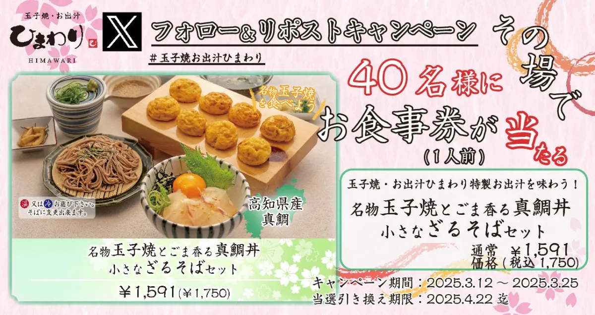2025年3月12日より、人気の和食チェーン「玉子焼・お出汁ひまわり」が高知県産真鯛を使用した特別メニューとキャンペーンを開始します。この期間中、フォロー&リポストキャンペーンを通じて、抽選で40名様に名物玉子焼とごま香る真鯛丼、小さなざるそばがセットになったお食事券をプレゼント!