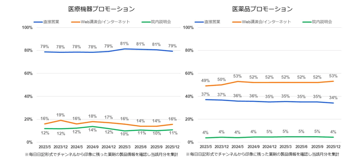 この傾向は、製薬企業のプロモーション活動においても同様に見られており、引き続き医師との直接の関わりが重視されています。