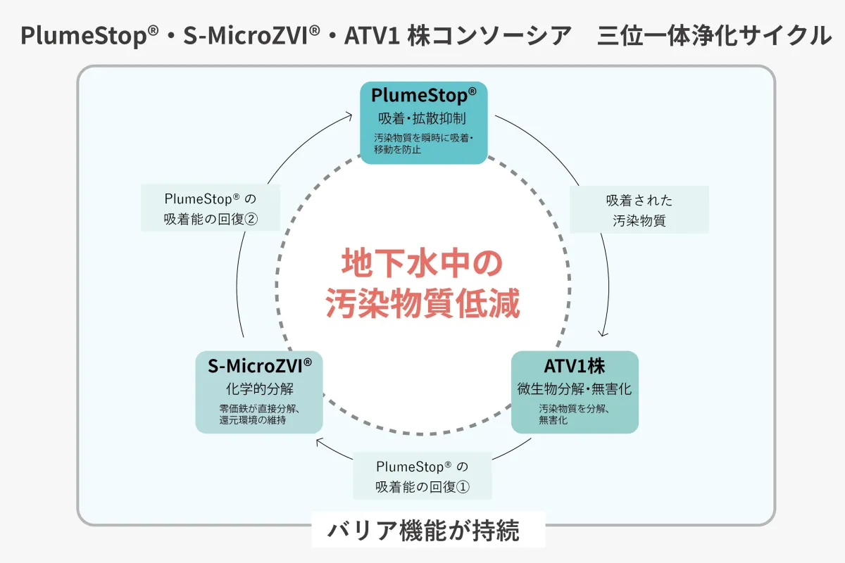 技術の中核をなすPlumeStop®(登録商標)は、地下水中の有害物質を効率的に吸着する特殊なコロイド状活性炭です。この物質は、化学的分解を促進する金属や微生物と組み合わされることで、その効果を最大限に引き出します。これにより、汚染物質は段階的に無害化され、長期的な環境保護に寄与します。