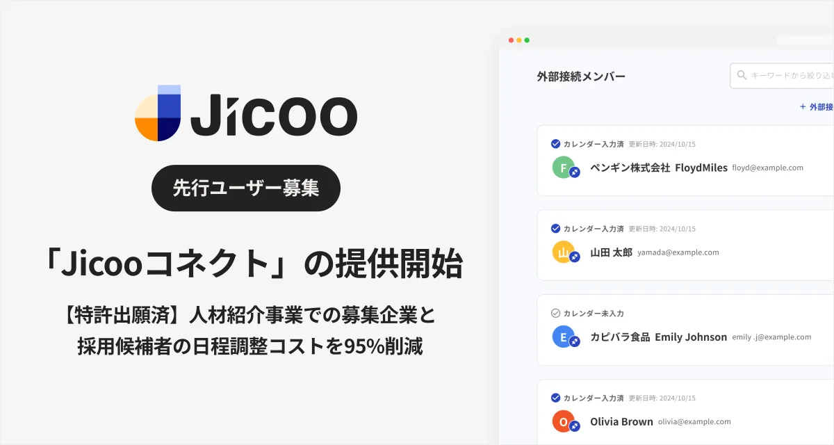 ジクー株式会社は、日程調整にかかる手間を大幅に削減する新技術「Jicooコネクト」の提供を開始しました。このサービスは、企業と人材紹介業者、そして採用候補者の3者間での日程調整を一つのURLで自動化し、95%のコスト削減を実現します。これまでの複雑なスケジュール管理を一新し、効果的な人材採用の手助けとなることを目指しています。