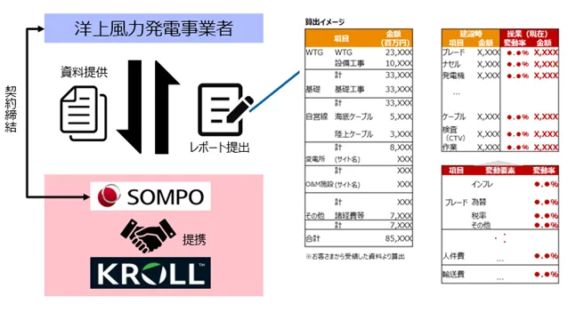 このサービスでは、洋上風力発電所の主要設備の保険価額を算出します。これには本体価格の他、再設置に必要な材料費や人件費、諸経費が含まれます。算定にはインフレーション指数、国際的な設備単価、為替動向、税制の変化などを反映し、現在の市場環境での妥当性を考慮します。さらに、グローバルに洋上風力発電所の評価実績を持つKROLL社と提携し、信頼性の高い評価を行います。この結果、適正な保険価額や免責金額の設定が可能となり、より合理的な保険設計が提案されます。