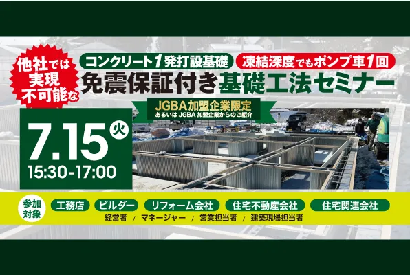 一般社団法人日本優良ビルダー普及協会(JGBA)は、2025年7月15日(火)に特別なセミナーを開催します。このセミナーは「他社では実現不可能な『コンクリート1発打設基礎』『凍結深度でもポンプ車1回』免震保証付き基礎工法」をテーマに、工務店やリフォーム会社に特化した内容となっています。
