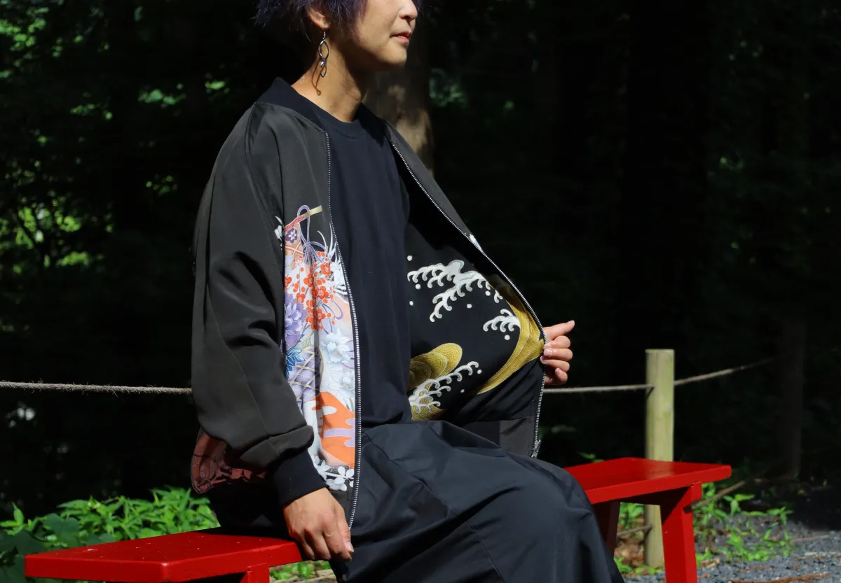 おうんちゃんが提案する新作のアップサイクルブルゾンは、着物柄の魅力を最大限に引き出すデザイン。リバーシブルで使用可能なこのブルゾンは、背面に鮮やかな着物柄を大胆に配置し、遠くからでも視認できる美しさを誇ります。このように、伝統技術と現代デザインが見事に交じり合うことで、生まれる“Spiritual Couture”を表現しています。