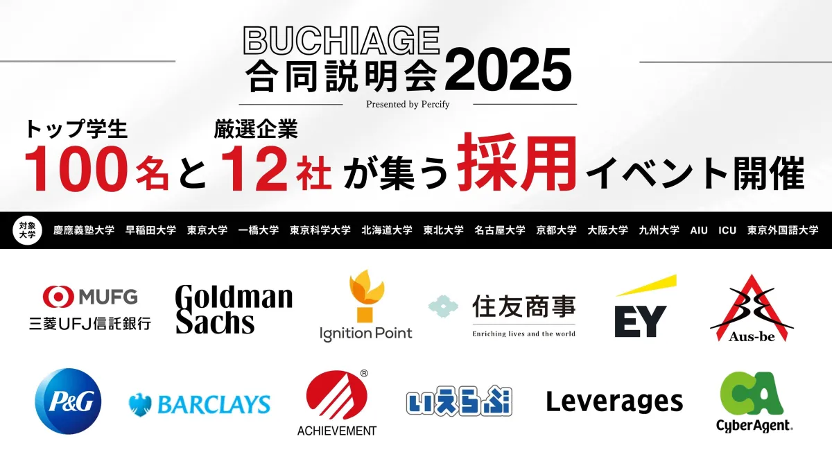 2025年3月21日に、思い描くキャリアを実現したいハイクラスの学生たちに向けて、初めてのオンライン合同説明会「BUCHIAGE合同説明会2025」が開催されました。このイベントは、キャリア支援を専門とするPercify株式会社が主催しており、今後のキャリアを真剣に考える学生と、各業界の注目企業が一堂に会する貴重な機会となりました。
