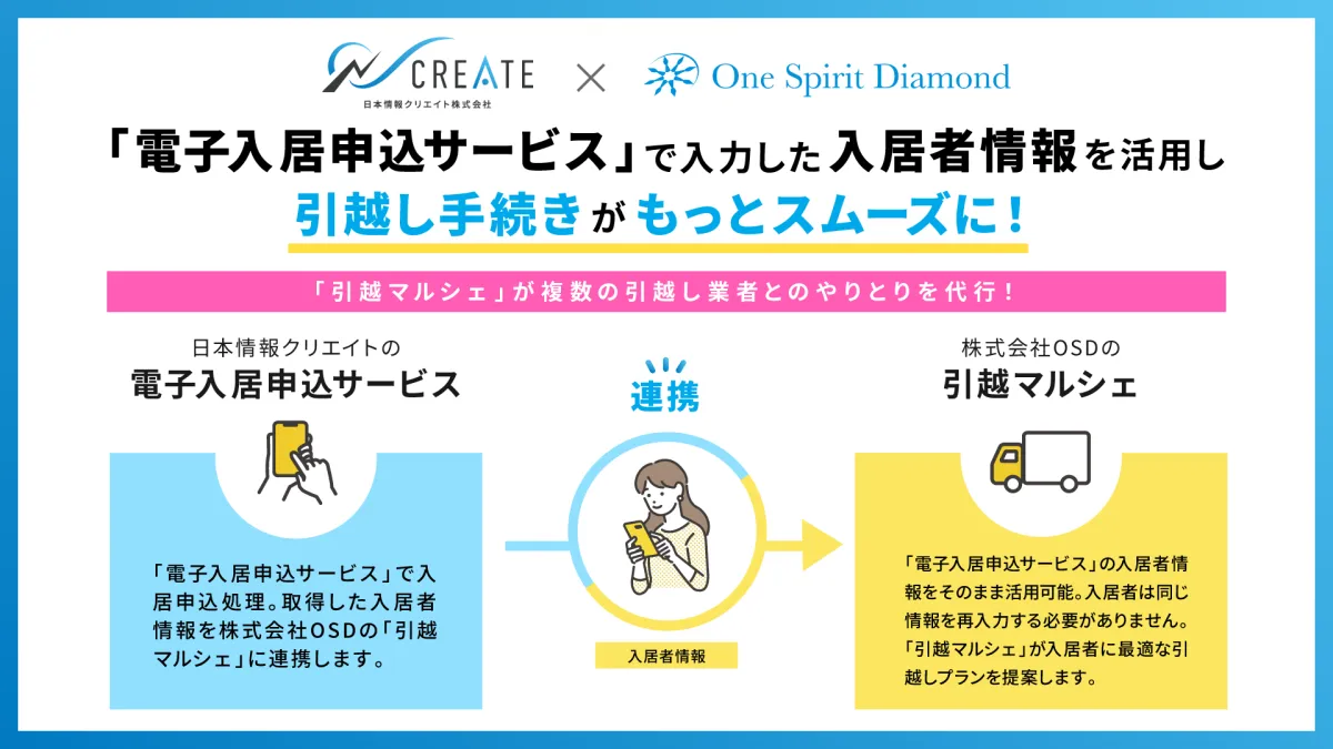 日本情報クリエイトは、不動産業界向けにITソリューションを提供する企業として長年にわたり業界を支えてきました。一方、OSDは次世代型引越し見積りサービス「引越マルシェ」を展開し、引越しに関する煩雑な業務をサポートしています。この二社の連携により、入居者に対して更に便利で効率的なサービスを提供することができるのです。