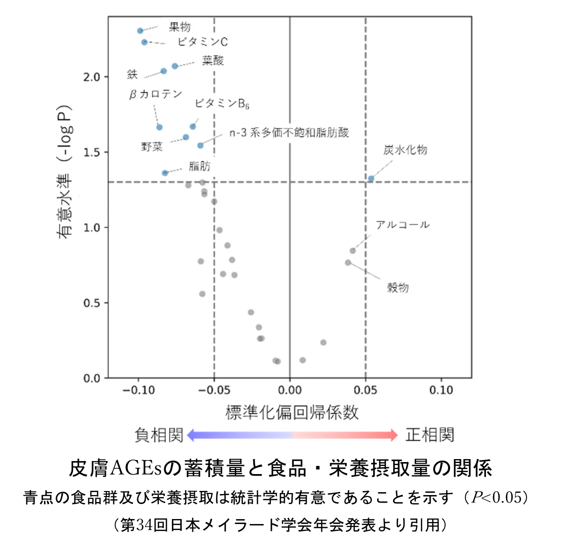 一方、「糖化年齢健診」は、加齢と共に皮膚に蓄積される終末糖化産物(AGEs)を高精度で測定し、短時間で「糖化年齢」を算出します。これは、美容や健康管理の指標として注目されており、先行研究では皮膚AGEsの量と実年齢との相関が報告されています。さらに、2024年の研究では、糖化年齢と血糖マーカーや抗酸化作用を有する食品群の摂取量との関連が確認されました。