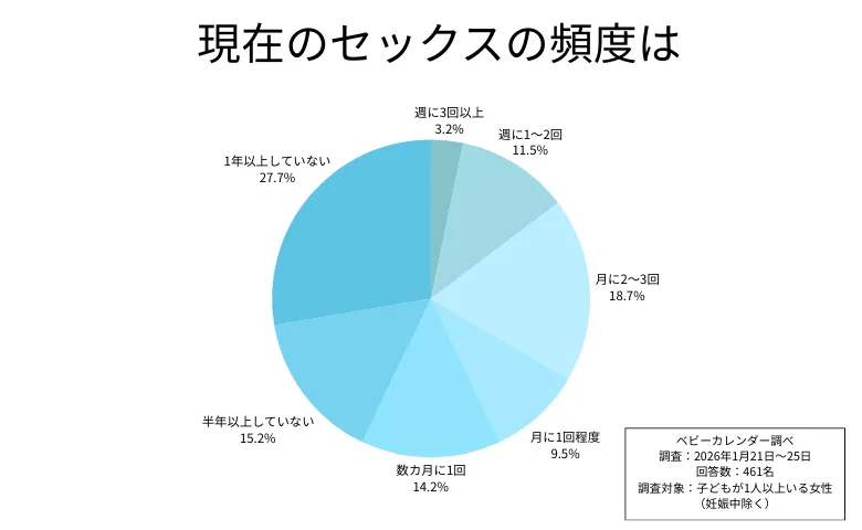 セックスの頻度についての調査において、なんと27.7%が「1年以上していない」と回答しました。一方で「週に1回以上」の頻度で行為を持つ家庭は全体の約14.7%と少数派でした。