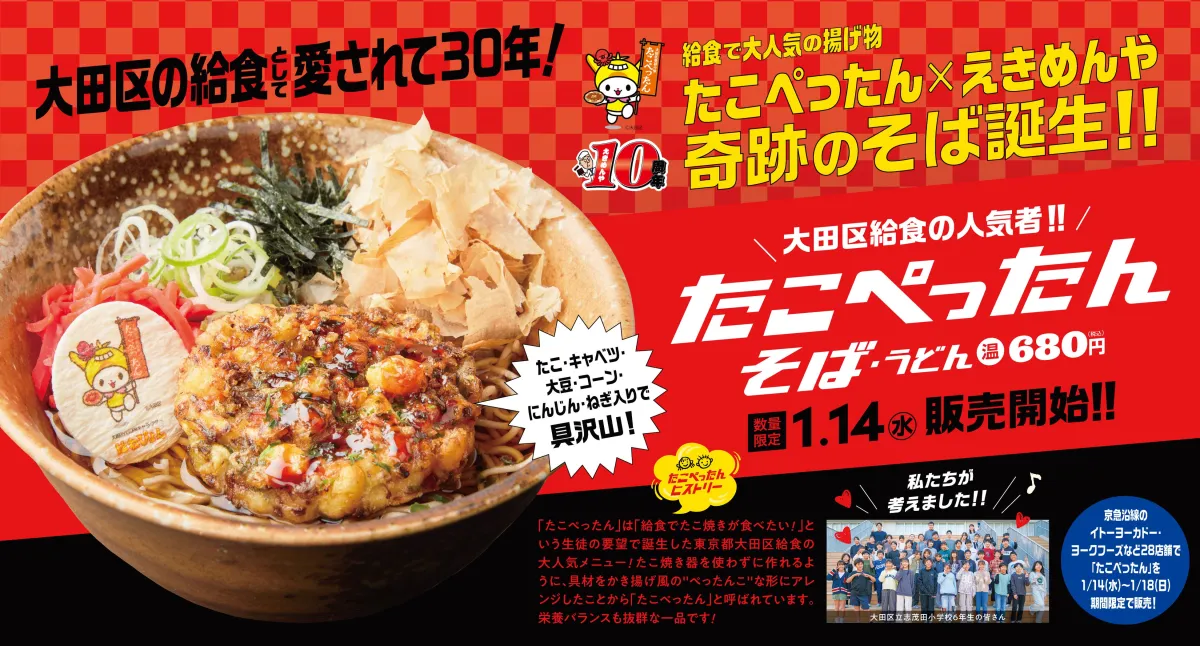 京急開発株式会社とそのグループ企業である京急ロイヤルフーズは、2026年1月14日から大田区発祥の給食メニュー「たこぺったん」を基にした新メニュー「たこぺったんそば」と「たこぺったんうどん」を数量限定で販売します。これは、京急沿線の駅そば店舗「えきめんや」や「麺丼屋」での取り扱いを予定しており、地域の人々からの期待が寄せられています。