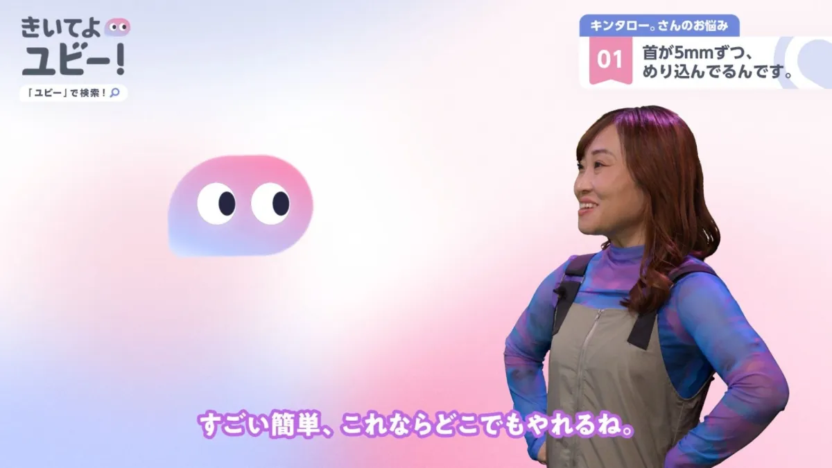 動画内では、「首が5ミリずつめり込んでいる」と感じる悩みを語るキンタロー。さんの様子が描かれています。アクティブな活動を続ける彼女にとって、首の痛みは生活の質を大きく下げる問題です。具体的には身長152センチの彼女には190センチの顔があるかのような負担を感じているとのこと。ユビーとの対話の中で、医療AIが彼女の悩みに耳を傾け、「視線エクササイズ」などのセルフケアの提案を行います。このシーンでは、ユビーがどのように彼女の心の支えになっているのかが映し出され、視聴者も共感せざるを得ません。
